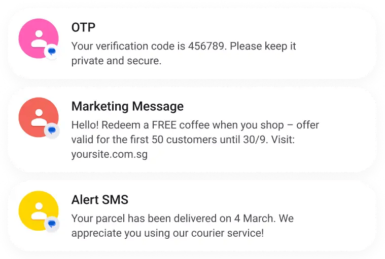 Integrate SMS into your product stack; trigger messages programmatically; scale across Singapore and 200+ countries.